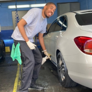 group of six people standing and sitting in front of a last vegas aviators sign young person cleaning a car